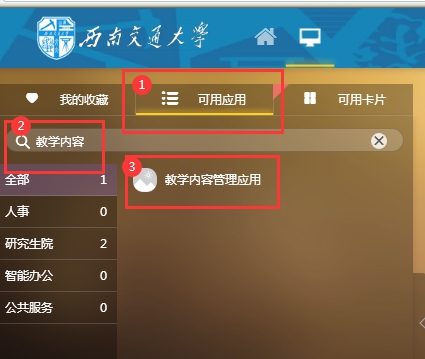 1.登录研究生系统后,在“可用应用”搜索栏,输入“教学内容”,点击“教学内容管理应用”,见下图: