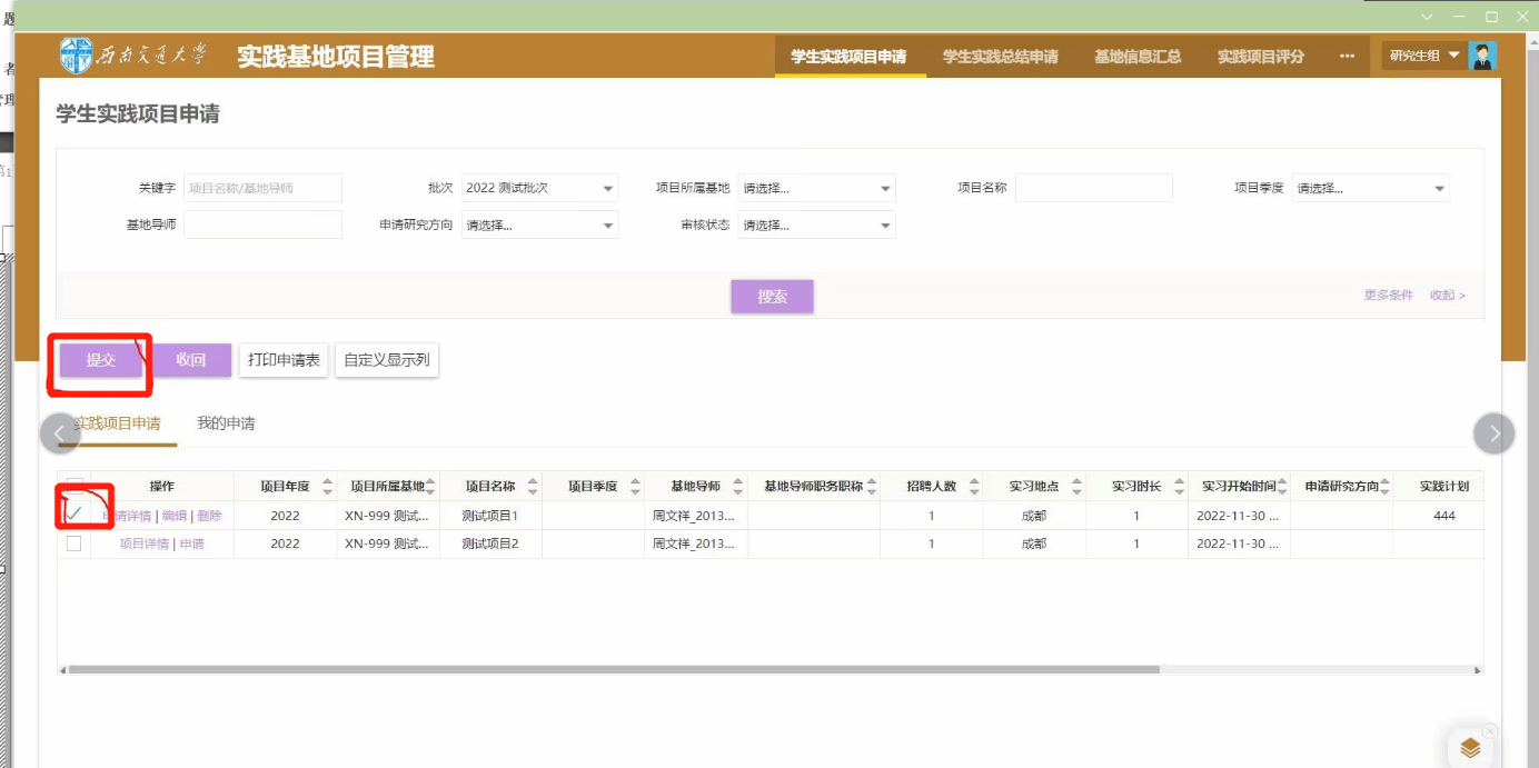 学生登录研究生院首页系统登录入口→实践管理→实践项目管理→学生实践项目申请(批次选择“2024年秋季校级校内实践”或“2024年秋季院级校内实践”)→选择适合的项目(每名学生只能选择一个项目)。学生报名完成后务必点击提交。